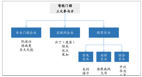 諸多市場參與者進入智能門鎖市場中。主要可分為六大類,其中:
